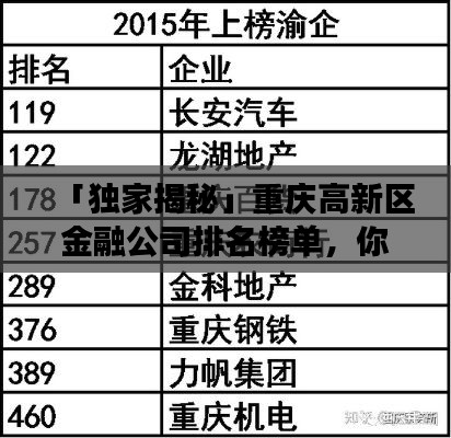 随着科技的飞速发展和全球经济的深度融合,金融业在各地的繁荣与进步日益引人注目,重庆高新区作为重庆市的重要发展引擎,其金融行业的发展尤为引人注目,本文将为您揭示重庆高新区金融公司的排名,带您了解这些公司的概况及在金融领域的影响力。