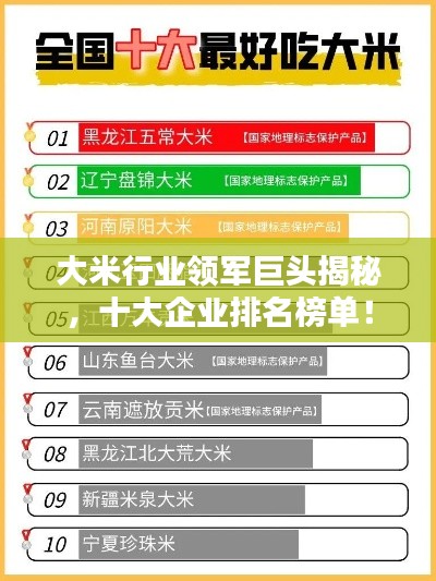 大米作为中国人餐桌上的主食,其生产企业的规模与品质一直备受关注,随着农业产业的不断升级与市场竞争的加剧,涌现出了一批优秀的大米生产企业,本文将为您介绍大米生产排名前十名企业,这些企业在行业内具有广泛的影响力,且产品品质优良、市场占有率高。