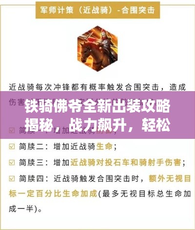 在热门游戏《铁甲雄心》中,佛爷以其强大的战斗能力和独特的英雄定位,成为众多玩家钟爱的角色之一,本文将为大家带来最新的铁骑佛爷出装攻略,帮助大家更好地掌握佛爷的装备搭配技巧,提升战斗能力,成为战场上的佼佼者。