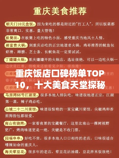 重庆,这座山城的美食文化举世闻名,各地的特色美食汇聚于此,让人流连忘返,本文将为您介绍重庆大小饭店排名前十名,这些饭店各具特色,口味独特,是重庆美食的佼佼者。