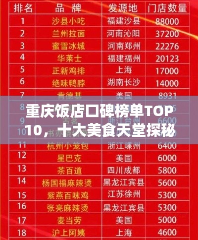 转载请注明来自工巨商城,本文标题:《重庆饭店口碑榜单TOP10,十大美食天堂探秘!》