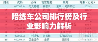 随着驾驶陪练行业的迅速发展,陪练车公司如雨后春笋般涌现,本文将针对陪练车公司的排名及其行业影响力进行探讨,以便读者更好地了解这一领域的现状和未来趋势。