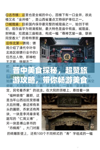 晋中,这片古老而富饶的土地,以其丰富的历史文化和独特的地域风情吸引着无数游客,这里,古老的建筑与现代气息交织,自然风光与人文景观相得益彰,而晋中的美食,更是不可或缺的一大亮点,就让我们一起走进晋中,探寻那里的旅游攻略与美食之旅。