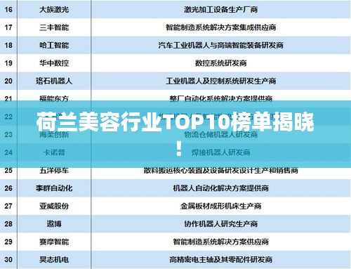 就是荷兰美容行业排名前十名的品牌和服务机构,它们以专业的技术、优质的服务和创新的理念,为荷兰美容行业的发展做出了杰出的贡献,如果您对美容行业感兴趣,不妨去这些品牌和服务机构体验一下,感受荷兰美容业的魅力。
