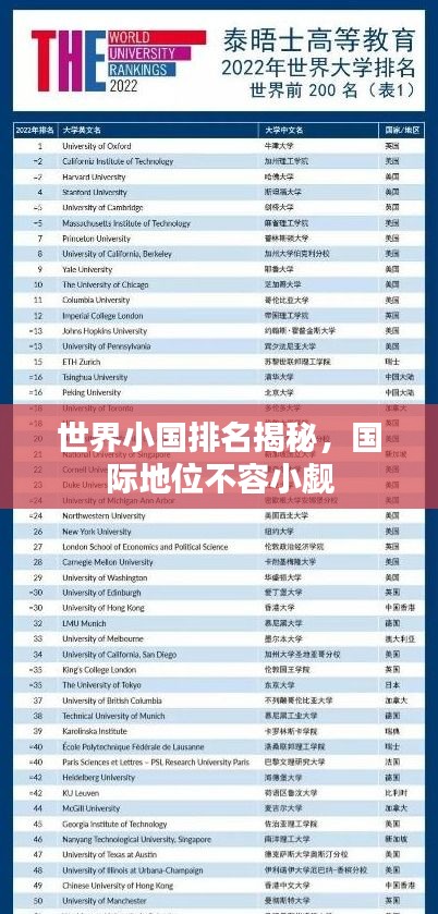 在全球化的世界中,每个国家都有其独特的地位和影响,当我们谈论“世界小国排名多少”时,我们不仅要关注其国土面积的大小,还要关注其在国际事务中的影响力、经济实力、文化贡献等多方面因素,本文将探讨全球小国的排名及其在国际舞台上的地位。