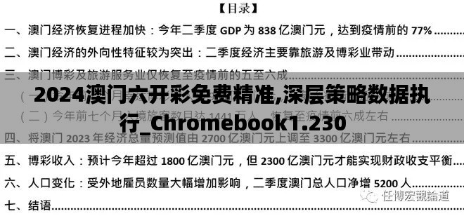 在澳门特区,六开彩作为一种受欢迎的彩票形式,不仅为市民提供了娱乐,也为特区的经济发展作出了贡献。本文旨在发布一份关于“2024澳门六开彩免费精准,深层策略数据执行_Chromebook1.230”的政策文件,详细介绍了澳门六开彩在2024年的执行策略和数据分析,以期为相关利益方提供参考和指导。
