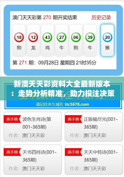 “新澳天天彩资料大全最新版本:走势分析精准,助力投注决策”是一份全方位、多元角度的澳门彩资料大全。我们结合全球大批投注专家的智慧结晶,以及新澳天天彩独有的数据分析算法,为您打造这份专业资料,以科技手段大幅提升走势的精准性,让投注也能变得科学、理性。在本文中,我们将重点介绍资料大全的几大核心板块,让您一目了然,轻松把握投注精髓。