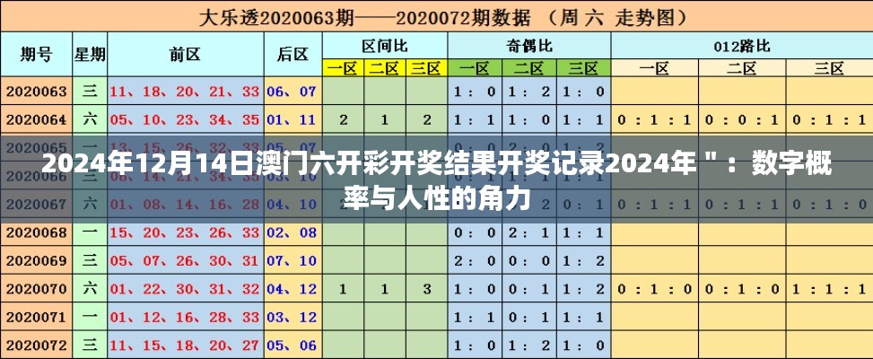 澳门,这座东方赌城以其独特的博彩文化闻名于世。在这里,不仅是金钱的游戏,更是数字与人性角力的舞台。今天我们将深入探讨2024年12月14日澳门六开彩开奖结果,一窥这场数字概率与人性角力的精彩记录。
