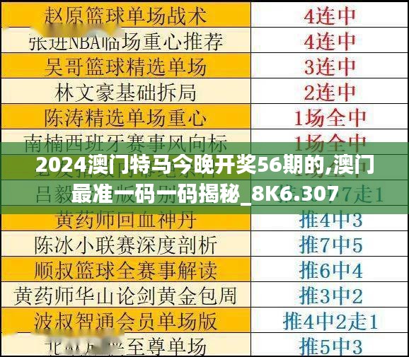 谈到澳门特马,不得不提到澳门最准一码一码揭秘_8K6.307这一神秘而诱人的概念。所谓“最准一码”,是指在赛马博彩中预测准确率最高的一组马匹号码。由于这些号码具有较高的胜率和奖金回报,因此深受博彩爱好者的关注。澳门最准一码一码揭秘_8K6.307是对此类号码的解密和分析,为公众提供了更为专业的投注参考。通过深入研究这一领域,人们可以更好地理解澳门特马背后的算法和概率学知识,提高投注的技巧和准确性。