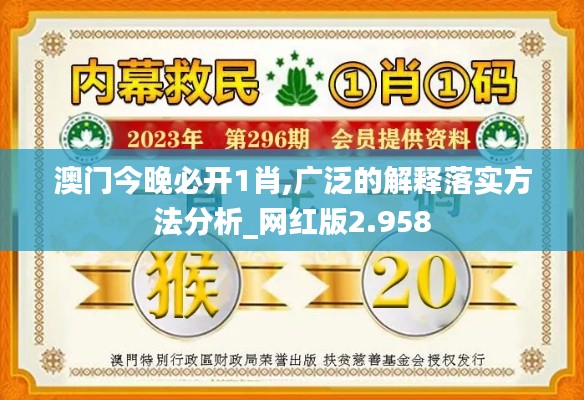 近年来,澳门特别行政区的经济、社会和文化发展越来越受到全球的关注。特别是在娱乐博彩业的繁荣之下,各种与博彩相关的活动和现象也不断涌现,其中之一便是“澳门今晚必开1肖”。“1肖”指的是博彩业中常见的一种动物竞赛形式,而“澳门今晚必开”的表述则暗示着这一事件的不可或缺性和吸引力。下面,我们将深入探讨“澳门今晚必开1肖,广泛的解释落实方法分析_网红版2.958”这一主题,旨在为读者提供全面、细致的解读。