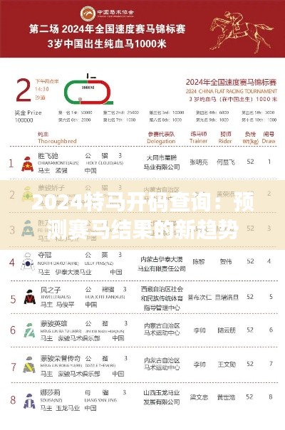 近年来,随着科技发展,赛马预测技术的进步吸引了众多马迷的关注。2024特马开码查询作为预测赛马结果的新趋势,为赛马行业带来了新的发展机遇。本文将详细介绍2024特马开码查询的特点、优势及其对赛马行业的影响,以帮助读者更深入地了解这一领域。