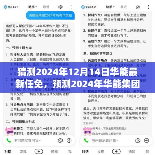 随着时代的发展,企业的人事变动成为关注焦点,本文旨在探讨即将到来的2024年12月14日,华能集团可能迎来的人事任免新动向,结合企业发展状况和行业趋势,对可能的变动进行预测分析,以期为读者提供有价值的参考信息。