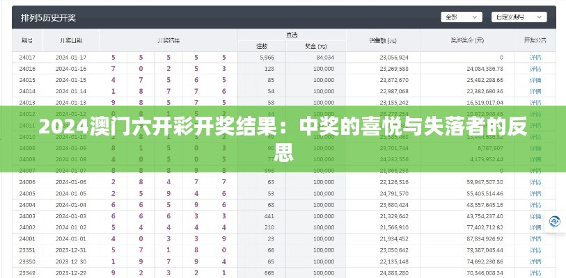 澳门六开彩作为澳门地区最受欢迎的彩票之一,每个开奖的日子都成为了人们共同关注的焦点。2024年的澳门六开彩开奖结果,不仅带来了中奖者的欢笑,也引发了失落者的深刻反思。本文旨在从不同角度,对2024澳门六开彩开奖结果进行深度分析,并探讨中奖的喜悦和失落者的反思给澳门社会的带来的影响。